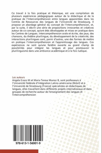 Ce travail à la fois pratique et théorique, est une compilation de plusieurs expériences pédagogiques autour de la didactique et de la pratique de l'Intercompréhension entre langues apparentées dans les Centres de Ressources des langues de l'Université de Strasbourg. Il propose un abordage général du concept de l'Intercompréhension, et, par la suite, il décrit une série de propositions innovantes et créatives autour de ce concept, qu'ont étés développées et mises en pratique dans les Centres de Langues. Intercompréhension orale et écrite, des jeux, des chansons, du théâtre plurilingue, du développement de la créativité, des interactions plurilingues sont, parmi d'autres, une des formes de mettre en pratique l'intercompréhension et l'apprentissage des langues. Ces expériences ne sont qu'une fenêtre ouverte au grand champ de possibilités pour intégrer les langues et pour promouvoir le plurilinguisme dans une ambiance académique et à la fois ludique.