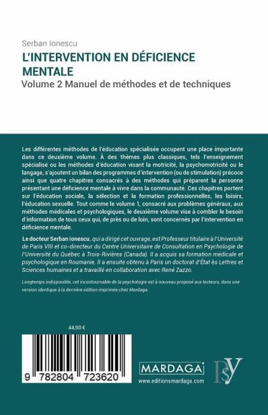 Les différentes méthodes de l'éducation spécialisée occupent une place importante dans ce deuxième volume. À des thèmes plus classiques, tels l'enseignement spécialisé ou les méthodes d'éducation visant la motricité, la psychomotricité ou le langage, s'ajoutent un bilan des programmes d'intervention (ou de stimulation) précoce ainsi que quatre chapitres consacrés à des méthodes qui préparent la personne présentant une déficience mentale à vivre dans la communauté. Ces chapitres portent sur l'éducation sociale, la sélection et la formation professionnelles, les loisirs, l'éducation sexuelle.//Tout comme le volume 1, consacré aux problèmes généraux, aux méthodes médicales et psychologiques, le deuxième volume vise à combler le besoin d'information de tous ceux qui, de près ou de loin, sont concernés par l'intervention en déficience mentale. Le docteur Serban Ionescu, qui a dirigé cet ouvrage, est Professeur titulaire à l¿Université de Paris VIII et co-directeur du Centre Universitaire de Consultation en Psychologie de l¿Université du Québec à Trois-Rivières (Canada). Il a acquis sa formation médicale et psychologique en Roumanie. Il a ensuite obtenu à Paris un doctorat d¿État ès Lettres et Sciences humaines et a travaillé en collaboration avec René Zazzo.