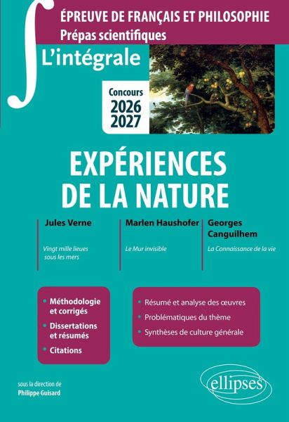 Programme 2026-2027 : Expériences de la nature. Vingt mille lieues sous les mers de Jules Verne, Le Mur invisible de Marlen Haushofer, La Connaissance de la vie de Georges Canguilhem. La collection ' L'Intégrale ' propose aux étudiants des CPGE scientifiques un manuel complet pour une préparation efficace de l'épreuve de français et philosophie. Réalisé par des spécialistes et des enseignants en CPGE dans un esprit pédagogique, il vise à doter et enrichir le candidat de connaissances claires et essentielles pour aborder sereinement tout type d'épreuve. Il propose ainsi : ¿ Une approche problématisée du thème ¿ Une lecture approfondie et condensée des uvres au programme ¿ Des dialogues construits entre les uvres ¿ Des synthèses philosophiques et historiques sur la question ¿ Un élargissement sur le thème dans le langage et la littérature ¿ Une ouverture au monde symbolique et artistique ¿ Une méthodologie suivie de dissertations détaillées et comparées ¿ Une méthodologie suivie de résumés corrigés