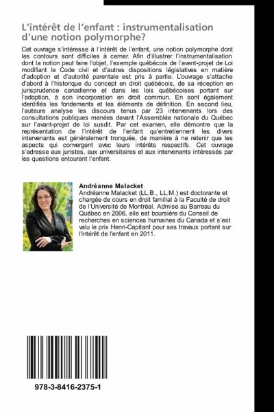 Cet ouvrage s intéresse à l intérêt de l enfant, une notion polymorphe dont les contours sont difficiles à cerner. Afin d illustrer l instrumentalisation dont la notion peut faire l objet, l exemple québécois de l avant-projet de Loi modifiant le Code civil et d autres dispositions législatives en matière d adoption et d autorité parentale est pris à partie. L ouvrage s attache d abord à l historique du concept en droit québécois, de sa réception en jurisprudence canadienne et dans les lois québécoises portant sur l adoption, à son incorporation en droit commun. En sont également identifiés les fondements et les éléments de définition. En second lieu, l auteure analyse les discours tenus par 23 intervenants lors des consultations publiques menées devant l Assemblée nationale du Québec sur l avant-projet de loi susdit. Par cet examen, elle démontre que la représentation de l intérêt de l enfant qu entretiennent les divers intervenants est généralement tronquée, de manière à ne retenir que les aspects qui convergent avec leurs intérêts respectifs. Cet ouvrage s adresse aux juristes, aux universitaires et aux intervenants intéressés par les questions entourant l enfant.