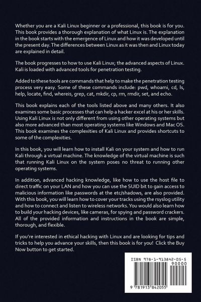 Whether you are a Kali Linux beginner or a professional, this book is for you. This book provides a thorough explanation of what Linux is. The explanation in the book starts with the emergence of Linux and how it was developed until the present day. The differences between Linux as it was then and Linux today are explained in detail. The book progresses to how to use Kali Linux; the advanced aspects of Linux. Kali is loaded with advanced tools for penetration testing. Added to these tools are commands that help to make the penetration testing process very easy. Some of these commands include: pwd, whoami, cd, ls, help, locate, find, whereis, grep, cat, mkdir, cp, rm, rmdir, set, and echo. This book explains each of the tools listed above and many others. It also examines some basic processes that can help a hacker excel at his or her skills. Using Kali Linux is not only different from using other operating systems but also more advanced than most operating systems like Windows and Mac OS. This book examines the complexities of Kali Linux and provides shortcuts to some of the complexities. In this book, you will learn how to install Kali on your system and how to run Kali through a virtual machine. The knowledge of the virtual machine is such that running Kali Linux on the system poses no threat to running other operating systems.In addition, advanced hacking knowledge, like how to use the host file to direct traffic on your LAN and how you can use the SUID bit to gain access to malicious information like passwords at the etc/shadows, are also provided. With this book, you will learn how to cover your tracks using the rsyslog utility and how to connect and listen to wireless networks. You would also learn how to build your hacking devices, like cameras, for spying and password crackers. All of the provided information and instructions in the book are simple, thorough, and flexible. If you're interested in ethical hacking with Linux and are looking for tips and tricks to help you advance your skills, then this book is for you! Click the Buy Now button to get started.