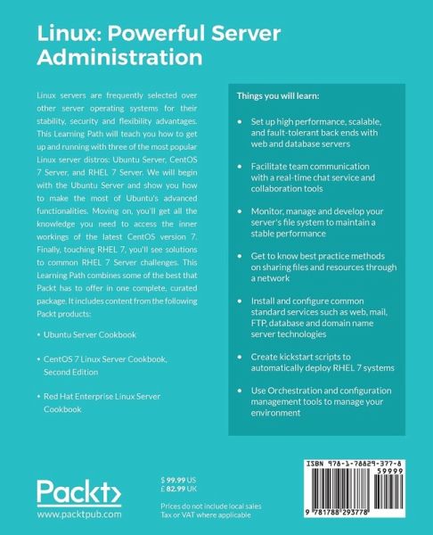 Get hands-on recipes to make the most of Ubuntu Server, CentOS 7 Linux Server and RHEL 7 Server Key Features:Get Linux servers up and running in seconds, In-depth guide to explore new features and solutions in server administration Maintain performance and security of your server solution by deploying expert configuration advice Book Description: Linux servers are frequently selected over other server operating systems for their stability, security and flexibility advantages.This Learning Path will teach you how to get up and running with three of the most popular Linux server distros: Ubuntu…mehr