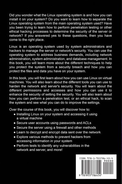 Did you wonder what the Linux operating system is and how you can install it on your system? Do you want to learn how to separate the Linux operating system from the main operating system used? Have you been trying to learn how to perform penetration testing or other ethical hacking processes to determine the security of the server or network? If you answered yes to these questions, then you have come to the right place. Linux is an operating system used by system administrators and hackers to manage the server or network's security. You can use the operating system to address business demands, including network administration, system administration, and database management. In this book, you will learn more about the different techniques to help you protect the system from a security breach and how you can protect the files and data you have on your system. In this book, you will first learn about how you can use Linux on virtual machines. You will also learn about the different tools you can use to harden the network and server's security. You will learn about the different permissions and accesses and how you can use it to enhance the security of setting the security. You will also learn about how you can perform a penetration test, or an ethical hack, to scan the system and see what you can do to improve the settings. Over the course of this book, you will discover how to: ¿ Installing Linux on your system and accessing it using a virtual machine ¿ Secure user accounts using passwords and ACLs ¿ Secure the server using a firewall and other methods ¿ Learn to decrypt and encrypt data sent over the network ¿ Explore various methods to prevent hackers from accessing information in your system ¿ Perform tests to identify any vulnerabilities in the network and server, and more!
