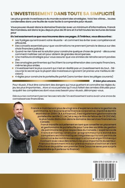 L'investissement dans toute sa simplicitéLes 49 conseils essentiels en matière de finances personnelles, de gestion de patrimoine et de trading que les pros devraient partager WallStreet Smart Les plus grands investisseurs du monde avaient des stratégies. Voici les vôtres... toutes condensées dans une feuille de route facile à comprendre. Vous avez de la discipline et de la patience ? Alors vous avez deux des compétences clés qui ont fait de Warren Buffett le milliardaire qu'il est aujourd'hui. Il est difficile de ne pas regarder le domaine de l'investissement et de la gestion de patrimoine et de ne pas penser qu'il y a trop à apprendre pour réussir... et en effet, il existe un grand nombre de livres approfondis qui donnent l'impression que c'est encore plus intimidant. Vous pourriez étudier la finance en profondeur pendant des années, tout en continuant à apprendre de nouvelles choses. Mais en avez-vous vraiment besoin ? Heureusement, la réponse est non. Il existe des raccourcis, et ces raccourcis reposent sur l'utilisation du travail de ceux qui vous ont précédé. Franck est dans le métier depuis plus de 20 ans et il a fait toutes les lectures de fond pour vous. Si vous avez soif de récolter les fruits de l'investissement, mais que vous n'avez pas la passion de vous plonger dans la littérature financière, vous avez de la chance. Vous pouvez réussir dans le domaine financier avec un minimum de connaissances de base. Tout ce dont vous avez besoin, c'est de quelqu'un qui identifie les points les plus importants pour vous et les condense en langage facile et accessible. Et c'est exactement ce que vous trouverez entre ces pages. À l'intérieur, vous découvrirez :¿ Les 9 pièges qui font obstacle à votre réussite - et comment les contourner avec habileté et efficacité.¿ Des conseils essentiels pour vous assurer que vos émotions ne prennent jamais le dessus sur des choix financiers judicieux.¿ Quand ne rien faire est la réponse pour construire quelque chose de grand - découvrez comment maîtriser cet art pour obtenir de grandes récompenses.¿ Ce que les gouvernements ne veulent pas que vous sachiez sur les régimes de retraite - et une meilleure stratégie pour vous assurer que vos années de retraite sont pavées d'or.¿ Des analogies attachantes qui rendent faciles à comprendre même les concepts financiers les plus arides.¿ L'investissement le plus courant qui n'est est pas vraiment un. Découvrez le secret que la plupart des investisseurs manquent (et prenez de meilleure décision).¿ 4 règles pour construire le portefeuille parfait (sans tomber dans les pièges courants). Et bien plus encore.