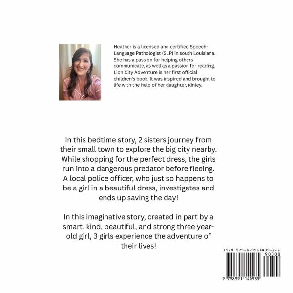 In this bedtime story, 2 sisters journey from their small town to explore the big city nearby. While shopping for the perfect dress, the girls run into a dangerous predator before fleeing. A local police officer, who just so happens to be a girl in a beautiful dress, investigates and ends up saving the day! In this imaginative story, created by a smart, kind, beautiful, and strong three year-old girl, 3 girls experience the adventure of their lives! Heather is a licensed and certified Speech-Language Pathologist (SLP) in south Louisiana. She has a passion for helping others communicate, as well as a passion for reading. Lion City Adventure is her first official children's book. It was inspired and brought to life with the help of her daughter, Kinley.
