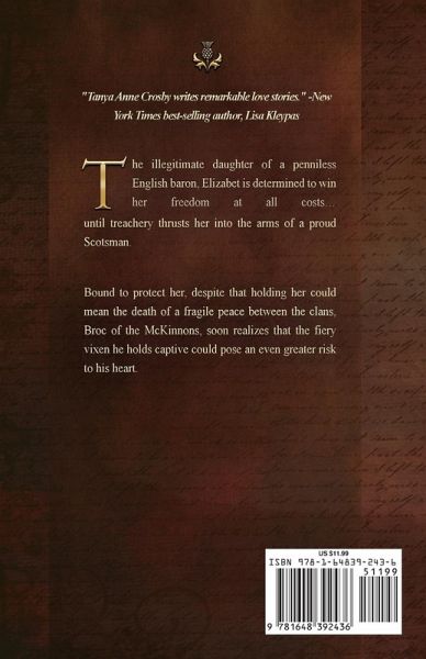 The illegitimate daughter of a penniless English baron, Elizabet is determined to win her freedom at all costs... until treachery thrusts her into the arms of a proud Scotsman. Bound to protect her, despite that holding her could mean the death of a fragile peace between the clans, Broc of the McKinnons, soon realizes that the fiery vixen he holds captive could pose an even greater risk to his heart.
