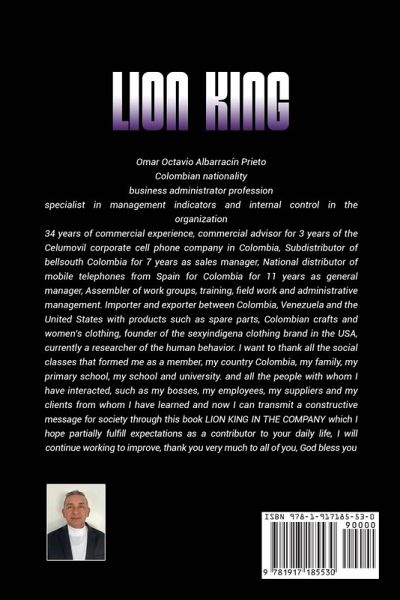 Omar Octavio Albarracín Prieto Colombian nationality business administrator profession specialist in management indicators and internal control in the organization 34 years of commercial experience, commercial advisor for 3 years of the Celumovil corporate cell phone company in Colombia, Sub distributor of bell south Colombia for 7 years as sales manager, National distributor of mobile telephones from Spain for Colombia for 11 years as general manager, Assembler of work groups, training, field work and administrative management. Importer and exporter between Colombia, Venezuela and the United States with products such as spare parts, Colombian crafts and women's clothing, founder of the sexy indigena clothing brand in the USA, currently a researcher of the human behavior. I want to thank all the social classes that formed me as a member, my country Colombia, my family, my primary school, my school and university. and all the people with whom I have interacted, such as my bosses, my employees, my suppliers and my clients from whom I have learned and now I can transmit a constructive message for society through this book LION KING IN THE COMPANY which I hope partially fulfill expectations as a contributor to your daily life, I will continue working to improve, thank you very much to all of you, God bless you