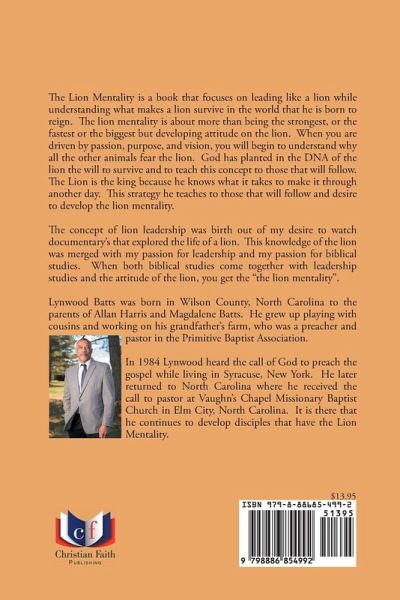 The Lion Mentality is a book that focuses on leading like a lion while understanding what makes a lion survive in the world that he is born to reign. The lion mentality is about more than being the strongest, or the fastest or the biggest but developing attitude on the lion. When you are driven by passion, purpose, and vision, you will begin to understand why all the other animals fear the lion. God has planted in the DNA of the lion the will to survive and to teach this concept to those that will follow. The Lion is the king because he knows what it takes to make it through another day. This strategy he teaches to those that will follow and desire to develop the lion mentality. The concept of lion leadership was birth out of my desire to watch documentary's that explored the life of a lion. This knowledge of the lion was merged with my passion for leadership and my passion for biblical studies. When both biblical studies come together with leadership studies and the attitude of the lion, you get the "the lion mentality". Lynwood Batts was born in Wilson County, North Carolina to the parents of Allan Harris and Magdalene Batts. He grew up playing with cousins and working on his grandfather's farm, who was a preacher and pastor in the Primitive Baptist Association. In 1984 Lynwood heard the call of God to preach the gospel while living in Syracuse, New York. He later returned to North Carolina where he received the call to pastor at Vaughn's Chapel Missionary Baptist Church in Elm City, North Carolina. It is there that he continues to develop disciples that have the Lion Mentality.