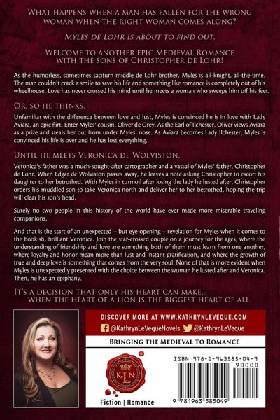 What happens when a man has fallen for the wrong woman when the right woman comes along? Myles de Lohr is about to find out. Welcome to another epic Medieval Romance with the sons of Christopher de Lohr! As the humorless, sometimes taciturn middle de Lohr brother, Myles is all-knight, all-the-time. The man couldn't crack a smile to save his life and something like romance is completely out of his wheelhouse. Love has never crossed his mind until he meets a woman who sweeps him off his feet. Or, so he thinks. Unfamiliar with the difference between love and lust, Myles is convinced he is in love with Lady Aviara, an epic flirt. Enter Myles' cousin, Oliver de Grey. As the Earl of Ilchester, Oliver views Aviara as a prize and steals her out from under Myles' nose. As Aviara becomes Lady Ilchester, Myles is convinced his life is over and he has lost everything. Until he meets Veronica de Wolviston. Veronica's father was a much-sought-after cartographer and a vassal of Myles' father, Christopher de Lohr. When Edgar de Wolviston passes away, he leaves a note asking Christopher to escort his daughter to her betrothed. With Myles in turmoil after losing the lady he lusted after, Christopher orders his muddled son to take Veronica north and deliver her to her betrothed, hoping the trip will clear his son's head. Surely no two people in this history of the world have ever made more miserable traveling companions. And that is the start of an unexpected - but eye-opening - revelation for Myles when it comes to the bookish, brilliant Veronica. Join the star-crossed couple on a journey for the ages, where the understanding of friendship and love are something both of them must learn from one another, where loyalty and honor mean more than lust and instant gratification, and where the growth of true and deep love is something that comes from the very soul. None of that is more evident when Myles is unexpectedly presented with the choice between the woman he lusted after and Veronica. Then, he has an epiphany. It's a decision that only his heart can make... when the heart of a lion is the biggest heart of all. Sons of de Lohr series: Lion of Twilight Lion of War Lion of Hearts Lion of Thunder Lion of Steel