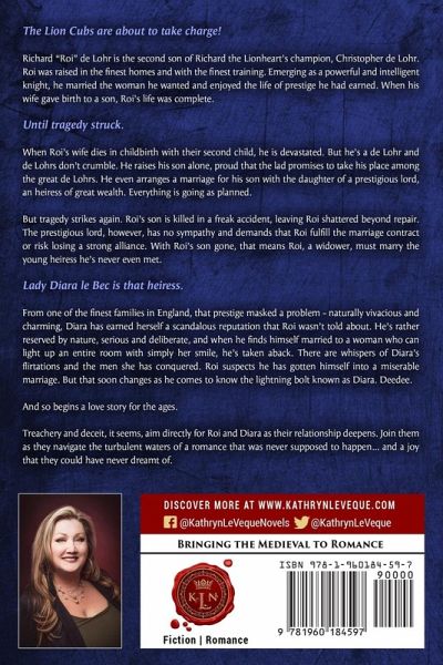 The Lion Cubs are about to take charge! Richard "Roi" de Lohr is the second son of Richard the Lionheart's champion, Christopher de Lohr. Roi was raised in the finest homes and with the finest training. Emerging as a powerful and intelligent knight, he married the woman he wanted and enjoyed the life of prestige he had earned. When his wife gave birth to a son, Roi's life was complete. Until tragedy struck. When Roi's wife dies in childbirth with their second child, he is devastated. But he's a de Lohr and de Lohrs don't crumble. He raises his son alone, proud that the lad promises to take his place among the great de Lohrs. He even arranges a marriage for his son with the daughter of a prestigious lord, an heiress of great wealth. Everything is going as planned. But tragedy strikes again. Roi's son is killed in a freak accident, leaving Roi shattered beyond repair. The prestigious lord, however, has no sympathy and demands that Roi fulfill the marriage contract or risk losing a strong alliance. With Roi's son gone, that means Roi, a widower, must marry the young heiress he's never even met. Lady Diara le Bec is that heiress. From one of the finest families in England, that prestige masked a problem - naturally vivacious and charming, Diara has earned herself a scandalous reputation that Roi wasn't told about. He's rather reserved by nature, serious and deliberate, and when he finds himself married to a woman who can light up an entire room with simply her smile, he's taken aback. There are whispers of Diara's flirtations and the men she has conquered. Roi suspects he has gotten himself into a miserable marriage. But that soon changes as he comes to know the lightning bolt known as Diara. Deedee. And so begins a love story for the ages. Treachery and deceit, it seems, aim directly for Roi and Diara as their relationship deepens. Join them as they navigate the turbulent waters of a romance that was never supposed to happen... and a joy that they could have never dreamt of.
