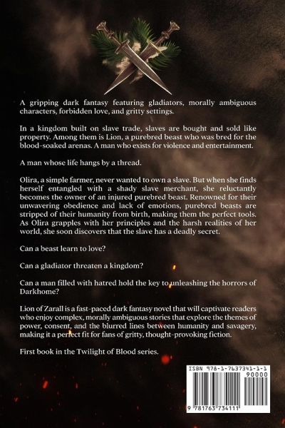 A grimdark gladiator fantasy featuring morally grey characters, forbidden love, and breathtaking arena combat. In a kingdom built on the slave trade, the king's champion gladiator receives a fate far worse than defeat-an order that makes every kill he's dealt in the arena feel merciful. When Lion, a gladiator bred for the arenas, finds a freeborn slave in his room, he must confront the invisible chains that bind him. If this freedom-obsessed woman breaks his deeply ingrained obedience, he'll face the horrors of White Tower. Olira, a simple farmer, never wanted to own a slave. But when she finds herself entangled with a shady slave merchant, she reluctantly becomes the owner of an injured gladiator. As Olira grapples with her principles and the harsh realities of her world, she's forced to uncover the secrets and scars the deadly gladiator keeps hidden. Lion of Zarall is a low-magic grimdark fantasy novel that will captivate readers who enjoy complex, morally grey stories. Perfect for fans of Mark Lawrence and Joe Abercrombie. First book in the Twilight of Blood series. --- Please note that Lion of Zarall is an adult grimdark fantasy and deals with some heavy subject matter that some readers may find triggering. Please refer to the full list of content warnings, available on author's website.