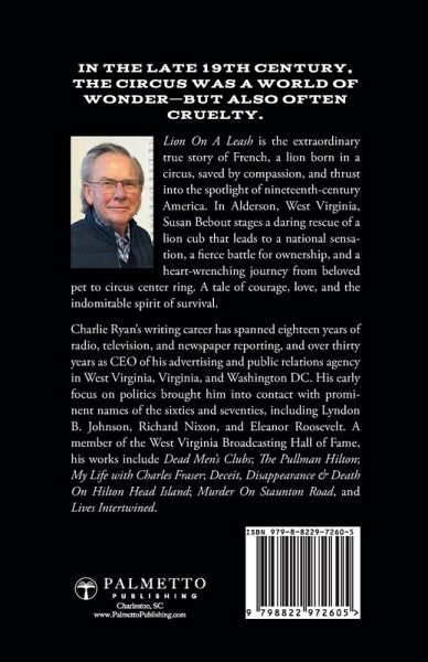 Based on the incredible true story of a lion cub born in captivity and the circus cavalcade that captivated a nation. In this remarkable novel based on a true story, journey back to just before the turn of the nineteenth century, when the circus held the heart of a nation, and a young lion became headline news for an entire generation. When a male African lion is born to French & Company's Great Railroad Show in Alderson, West Virginia, the company fears lost profits as the cub's mother, the star of their production, turns to nurturing her offspring. The circus orders the cub drowned. Susan Bebout, wife of the town's blacksmith, comes to the rescue, taking in the cub and raising it in domesticity, where it is beloved by many in the community-but loathed by others as a dangerous predator. As newspapers around the nation tell the story of the rescued lion, circuses compete to own him-and so does the Smithsonian National Park Zoo. Emerging from the fray is the Barnum & Bailey Circus, eventually becoming home to the cub and billing him as ferocious, shocking Susan, who raised him to be a gentle creature. The lion, named "French" after the circus where he was born, became a national sensation-and this is his story. Lion On A Leash journeys across thousands of miles, exposing the beautiful and the sinister in the nineteenth century circus cavalcade. For fans of animal stories, the early era of show business, and historical fiction, French's story will surprise, delight, and remind readers that every living thing deserves a chance to thrive.