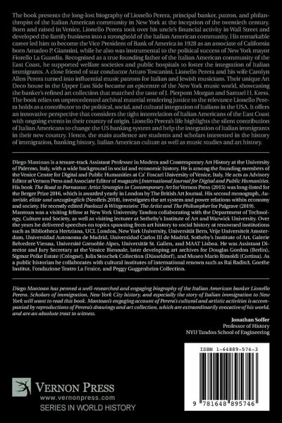 The book presents the long-lost biography of Lionello Perera, principal banker, patron, and philanthropist of the Italian American community in New York at the inception of the twentieth century. Born and raised in Venice, Lionello Perera took over his uncle's financial activity in Wall Street and developed the family business into a stronghold of the Italian American community. His remarkable career led him to become the Vice President of Bank of America in 1928 as an associate of California born Amadeo P. Giannini, while he also was instrumental to the political success of New York mayor Fiorello La Guardia. Recognised as a true founding father of the Italian American community of the East Coast, he supported welfare societies and public hospitals to foster the integration of Italian immigrants. A close friend of star conductor Arturo Toscanini, Lionello Perera and his wife Carolyn Allen Perera turned into influential music patrons for Italian and Jewish musicians. Their unique Art Deco house in the Upper East Side became an epicentre of the New York music world, showcasing the banker's refined art collection that matched the taste of J. Pierpont Morgan and Samuel H. Kress. The book relies on unprecedented archival material rendering justice to the relevance Lionello Perera holds as a contributor to the political, social, and cultural integration of Italians in the USA. It offers an innovative perspective that considers the tight interrelation of Italian Americans of the East Coast with ongoing events in their country of origin. Lionello Perera's life highlights the silent contribution of Italian Americans to change the US banking system and help the integration of Italian immigrants in their new country. Hence, the main audience are students and scholars interested in the history of immigration, banking history, Italian American culture as well as music studies and art history.