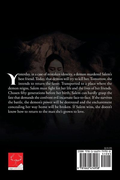 "Yesterday, in a case of mistaken identity, a demon murdered Salem's best friend. Today, that demon will try to kill her. Tomorrow, she intends to return the favor. Transported to a place where the demon reigns, Salem must fight for her life and the lives of her friends. Chosen fifty generations before her birth, Salem can hardly grasp the fate that demands she confront evil incarnate face-to-face. If she survives the battle, the demon's power will be destroyed and the enchantment concealing her way home will be broken. If Salem wins, she doesn't know how to return to the man she's grown to love."