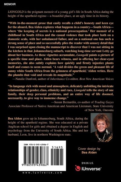 LIONGOLD is the poignant memoir of a white girl growing up in South Africa during the height of the apartheid regime. Sometimes gently ironic, at other times funny, sad or shocking, this book describes life in a beautiful place, at an ugly time in its history. Bea Alden grew up in Johannesburg, a tall city founded on a vast wealth of gold being mined day and night in deep underground shafts by an army of black laborers. Above and below ground, around the entire country, blacks did hard physical work on behalf of whites. Apartheid encouraged white families to employ black servants, and Bea's parents saw no bias in this practice. In that place and time, it seemed quite normal. Her father's mental illness was their secret shame, and the family lived in dread of it becoming known in their own white circle. In language rich with mood and atmosphere, delicately unfolding the intricate relationships of gender, class, ethnicity and race, LIONGOLD tells the story of one family, their tragic problems, and an entire way of life doomed, necessarily, to give way to immense change.