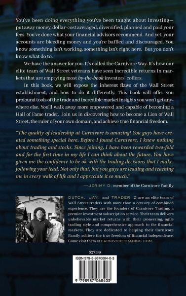 You've been doing everything you've been taught about investing - put away money, dollar-cost averaged, diversified, planned, and paid your fees. You've done what your financial advisors recommend. And yet, your accounts are bleeding money and you're baffled and discouraged. You know something isn't working; something isn't right here. But you don't know what do to. We have the answer for you. It's called the Carnivore Way. It's how our elite team of Wall Street veterans has seen incredible returns in markets that are emptying most by-the-book investors' coffers. In this book, we will expose the inherent flaws of the Wall Street establishment, and how to do it differently. This book will offer you profound tools of the trade and incredible market insights you won't get anywhere else. You'll walk away more empowered and capable of becoming a Hall of Fame trader. Join us in discovering how to become a Lion of Wall Street, the ruler of your own domain, and achieve true financial freedom.