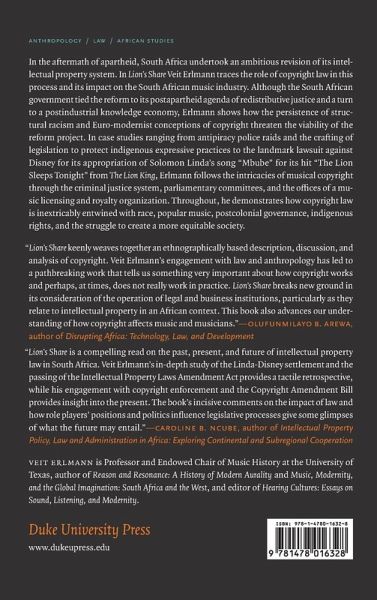 In the aftermath of apartheid, South Africa undertook an ambitious revision of its intellectual property system. In Lion's Share Veit Erlmann traces the role of copyright law in this process and its impact on the South African music industry. Although the South African government tied the reform to its postapartheid agenda of redistributive justice and a turn to a postindustrial knowledge economy, Erlmann shows how the persistence of structural racism and Euro-modernist conceptions of copyright threaten the viability of the reform project. In case studies ranging from antipiracy police raids and the crafting of legislation to protect indigenous expressive practices to the landmark lawsuit against Disney for its appropriation of Solomon Linda's song "Mbube" for its hit "The Lion Sleeps Tonight" from The Lion King, Erlmann follows the intricacies of musical copyright through the criminal justice system, parliamentary committees, and the offices of a music licensing and royalty organization. Throughout, he demonstrates how copyright law is inextricably entwined with race, popular music, postcolonial governance, indigenous rights, and the struggle to create a more equitable society.
