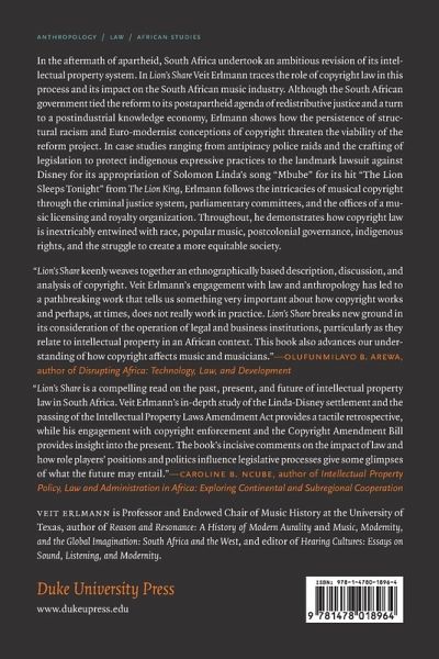 In the aftermath of apartheid, South Africa undertook an ambitious revision of its intellectual property system. In Lion's Share Veit Erlmann traces the role of copyright law in this process and its impact on the South African music industry. Although the South African government tied the reform to its postapartheid agenda of redistributive justice and a turn to a postindustrial knowledge economy, Erlmann shows how the persistence of structural racism and Euro-modernist conceptions of copyright threaten the viability of the reform project. In case studies ranging from antipiracy police raids and the crafting of legislation to protect indigenous expressive practices to the landmark lawsuit against Disney for its appropriation of Solomon Linda's song "Mbube" for its hit "The Lion Sleeps Tonight" from The Lion King, Erlmann follows the intricacies of musical copyright through the criminal justice system, parliamentary committees, and the offices of a music licensing and royalty organization. Throughout, he demonstrates how copyright law is inextricably entwined with race, popular music, postcolonial governance, indigenous rights, and the struggle to create a more equitable society.