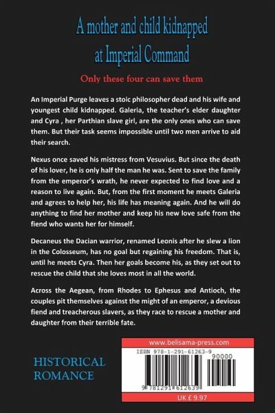 An Imperial Purge leaves a stoic philosopher dead and his wife and youngest child kidnapped. Galeria, the teacher's daughter and Cyra, her slave girl, are the only ones who can save them. But their task seems impossible until two men arrive to aid their search. Nexus is only half the man he was since the death of his lover. Sent to save the family from the emperor's wrath, he never expected to find love and a reason to live again. But, from the first moment he meets Galeria and agrees to help her, his life has meaning once more. Decaneus, the Dacian warrior, renamed Leonis after he slew a lion in the Colosseum, has no goal but regaining his freedom. That is, until he meets Cyra. Then her goals become his, as they set out to rescue the child that she loves most in all the world. Across the Aegean, the couples pit themselves against the might of an emperor, a devious fiend and treacherous slavers, as they race to rescue a mother and daughter from their terrible fate.