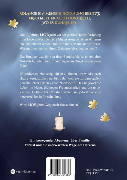 Die 14-jährige Lior steht vor der größten Herausforderung ihres Lebens. Nachdem ihre Mutter sie gegen ihren Willen in ein Kinderheim schickt, fühlt sie sich einsam und verlassen. Warum muss sie von ihrem Zuhause Abschied nehmen? Das Einzige, was Lior von ihrer Familie bleibt, ist das alte Notizbuch, gefüllt mit Erinnerungen aus längst vergangenen Zeiten. Entschlossen, eine Möglichkeit zu finden, um wieder nach Hause zurückzukehren, führt ihr Weg sie zum zauberhaften Laden Lumis Bücherwelt. Doch das ungewohnte Leben im Heim, die neuen Freundschaften und die unbekannten Gefühle für Christian stellen Lior vor eine herzzerreißende Entscheidung. Wird sie den Weg nach Hause finden? Ein bewegendes Abenteuer über Familie, Verlust und die unerwarteten Wege des Herzens.