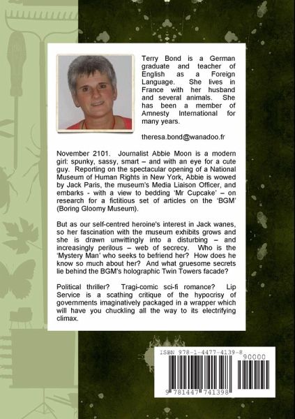 November 2101. Journalist Abbie Moon is a modern girl: spunky, sassy, smart - and with an eye for a cute guy. Reporting on the spectacular opening of a National Museum of Human Rights in New York, Abbie is wowed by Jack Paris, the museum's Media Liaison Officer, and embarks - with a view to bedding 'Mr Cupcake' - on research for a fictitious set of articles on the 'BGM' (Boring Gloomy Museum). But as our self-centred heroine's interest in Jack wanes, so her fascination with the museum exhibits grows and she is drawn unwittingly into a disturbing - and increasingly perilous - web of secrecy. Who is the 'Mystery Man' who seeks to befriend her? How does he know so much about her? And what gruesome secrets lie behind the BGM's holographic Twin Towers facade? Political thriller? Tragi-comic sci-fi romance? Lip Service is a scathing critique of the hypocrisy of governments imaginatively packaged in a wrapper which will have you chuckling all the way to its electrifying climax.
