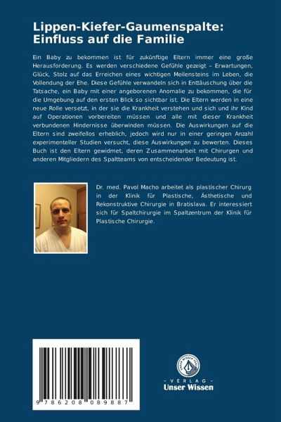 Ein Baby zu bekommen ist für zukünftige Eltern immer eine große Herausforderung. Es werden verschiedene Gefühle gezeigt - Erwartungen, Glück, Stolz auf das Erreichen eines wichtigen Meilensteins im Leben, die Vollendung der Ehe. Diese Gefühle verwandeln sich in Enttäuschung über die Tatsache, ein Baby mit einer angeborenen Anomalie zu bekommen, die für die Umgebung auf den ersten Blick so sichtbar ist. Die Eltern werden in eine neue Rolle versetzt, in der sie die Krankheit verstehen und sich und ihr Kind auf Operationen vorbereiten müssen und alle mit dieser Krankheit verbundenen Hindernisse überwinden müssen. Die Auswirkungen auf die Eltern sind zweifellos erheblich, jedoch wird nur in einer geringen Anzahl experimenteller Studien versucht, diese Auswirkungen zu bewerten. Dieses Buch ist den Eltern gewidmet, deren Zusammenarbeit mit Chirurgen und anderen Mitgliedern des Spaltteams von entscheidender Bedeutung ist.
