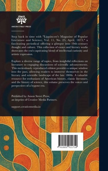 Step back in time with "Lippincott's Magazine of Popular Literature and Science, Vol. 11, No. 25, April, 1873," a fascinating periodical offering a glimpse into 19th-century thought and culture. This collection of essays and literary works showcases the era's captivating blend of intellectual curiosity and artistic expression. Explore a diverse range of topics, from insightful reflections on literature to engaging discussions of scientific advancements. This meticulously reproduced edition provides a unique window into the past, allowing readers to immerse themselves in the literary and scientific landscape of the late 1800s. A valuable resource for enthusiasts of American history, classic literature, and the history of science, this volume preserves the voices and perspectives of a bygone era. This work has been selected by scholars as being culturally important, and is part of the knowledge base of civilization as we know it. This work is in the public domain in the United States of America, and possibly other nations. Within the United States, you may freely copy and distribute this work, as no entity (individual or corporate) has a copyright on the body of the work. Scholars believe, and we concur, that this work is important enough to be preserved, reproduced, and made generally available to the public. We appreciate your support of the preservation process, and thank you for being an important part of keeping this knowledge alive and relevant.