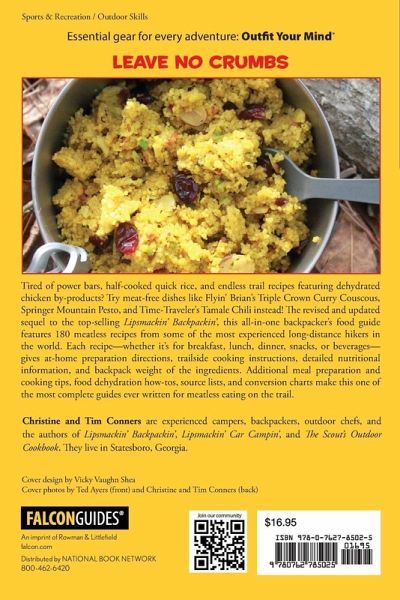 Christine and Tim Conners are experienced campers, backpackers, outdoor chefs, and the authors of Lipsmackin’ Backpackin’, Lipsmackin’ Car Campin’, and The Scout’s Outdoor Cookbook. They live in Statesboro, Georgia.