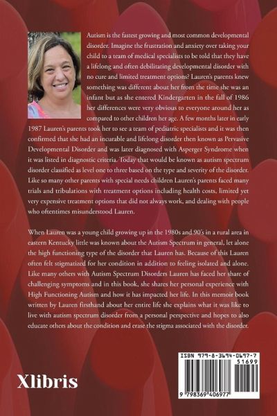 Autism is the fastest growing and most common developmental disorder. Imagine the frustration and anxiety over taking your child to a team of medical specialists to be told that they have a lifelong and often debilitating developmental disorder with no cure and limited treatment options? Lauren's parents knew something was different about her from the time she was an infant but as she entered Kindergarten in the fall of 1986 her differences were very obvious to everyone around her as compared to other children her age. A few months later in early 1987 Lauren's parents took her to see a team of pediatric specialists and it was then confirmed that she had an incurable and lifelong disorder then known as Pervasive Developmental Disorder and was later diagnosed with Asperger Syndrome when it was listed in diagnostic criteria. Today that would be known as autism spectrum disorder classified as level one to three based on the type and severity of the disorder. Like so many other parents with special needs children Lauren's parents faced many trials and tribulations with treatment options including health costs, limited yet very expensive treatment options that did not always work, and dealing with people who oftentimes misunderstood Lauren. When Lauren was a young child growing up in the 1980s and 90's in a rural area in eastern Kentucky little was known about the Autism Spectrum in general, let alone the high functioning type of the disorder that Lauren has. Because of this Lauren often felt stigmatized for her condition in addition to feeling isolated and alone. Like many others with Autism Spectrum Disorders Lauren has faced her share of challenging symptoms and in this book, she shares her personal experience with High Functioning Autism and how it has impacted her life. In this memoir book written by Lauren firsthand about her entire life she explains what it was like to live with autism spectrum disorder from a personal perspective and hopes to also educate others about the condition and erase the stigma associated with the disorder.