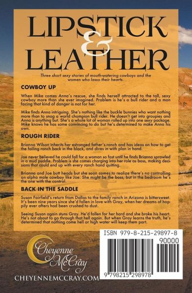 Lipstick & Leather Three short sexy stories of mouth-watering cowboys and the women who lasso their hearts. Cowboy Up When Mike comes Anna's rescue, she finds herself attracted to the tall, sexy cowboy more than she ever imagined. Problem is he's a bull rider and a man facing that kind of danger is not for her. Mike finds Anna intriguing. She's nothing like the buckle bunnies who want nothing more than to snag a world champion bull rider. He doesn't get into groupies and Anna is anything but. She's a whole lot of woman rolled up into one sexy package. Mike knows he has some convincing to do but he's determined to make Anna his own. Rough Rider Brianna Wilson inherits her estranged father's ranch and has ideas on how to get the failing ranch back in the black, and dives in with plan in hand. Joe never believed he could fall for a woman so fast until he finds Brianna sprawled in a mud puddle. Problem is she comes charging into her role as boss, making decisions that could end up with every ranch hand quitting. Brianna and Joe butt heads but she soon comes to realize there's no controlling an alpha male cowboy like Joe. She might be the boss, but in the bedroom he's the one with the control. Back in the Saddle Susan Fairfield's return from Dallas to the family ranch in Arizona is bittersweet. It's been nine years since she'd fallen in love with Gray, when her dreams of happily ever afters had been crushed to dust. Seeing Susan again stuns Gray. He'd fallen for her hard and she broke his heart. He's not about to go through that hell again. But when Gray learns the truth, he's determined that nothing come hell or high water will keep them part.