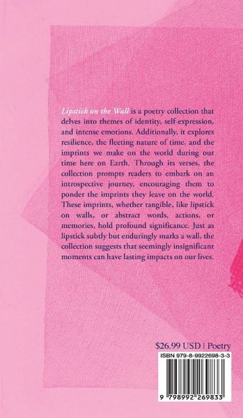 Lipstick on the Wall is a poetry collection that delves into themes of identity, self-expression, and intense emotions. Additionally, it explores resilience, the fleeting nature of time, and the imprints we make on the world during our time here on Earth. Through its verses, the collection prompts readers to embark on the introspective journey, encouraging them to ponder the imprints they leave on the world. These imprints, whether tangible, like lipstick on walls, or abstract words, actions, or memories, hold profound significance. Just as lipstick subtly but enduringly marks a wall, the collection suggests that seemingly insignificant moments can have lasting impacts on our lives.
