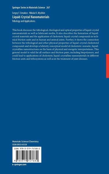 This book discusses the tribological, rheological and optical properties of liquid-crystal nanomaterials as well as lubricant media. It also describes the formation of liquid-crystal materials and the application of cholesteric liquid-crystal compounds in technical friction units and in human and animal joints. Further, it shows the connection between the tribological and other physical properties of liquid-crystal cholesterol compounds and develops a lubricity conceptual model of cholesteric-nematic, liquid-crystalline nanostructures on the basis of physical and energetic interpretations. This general model is valid for all surfaces and friction pairs, including biopolymers, and could lead to applications of cholesteric liquid-crystalline nanomaterials in different friction units and tribosystems as well as in the treatment of joint diseases.