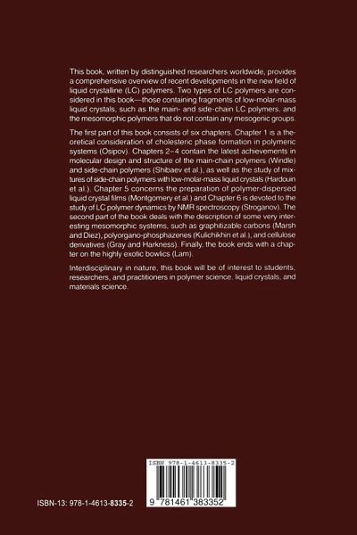 1 Molecular Theory of Cholesteric Polymers.- 1.1 Introduction.- 1.2 Elementary Models for Chiral Molecules.- 1.3 Chiral Anisotropic Interaction Between Macromolecules in the Solvent.- 1.4 Statistical Theory of Cholesteric Ordering.- 1.5 Influence of Molecular Flexibility on the Cholesteric Ordering in Polymer Solutions.- References.- 2 Structure of Thermotropic Main-Chain Polymers.- 2.1 Introduction.- 2.2 Molecular Architecture.- 2.3 Levels of Order in Mesophases of Main-Chain Liquid Polymers.- References.- 3 Molecular Architecture and Structure of Thermotropic Liquid Crystal Polymers with Mesogenic Side Groups.- 3.1 Introduction.- 3.2 Molecular Architecture of Liquid Crystal Polymers.- 3.3 Specific Features of Comb-Shaped Polymers Associated with Their Macromolecular Nature.- 3.4 Mesophase Types of Comb-Shaped Liquid Crystal Polymers. Problems of Classification.- 3.5 Effect of Mesophase Type on the Structure of Polymers Oriented by Uniaxial Drawing.- 3.6 Placement of the Main-Chain in Smectic and Nematic Phases of Comb-Shaped Liquid Crystal Polymers.- 3.7 Structure of Cholesteric Polymers.- References.- 4 Phase Behavior of High- and Low-Molar-Mass Liquid Crystal Mixtures.- 4.1 Introduction.- 4.2 Binary Mixtures of Low-Molar-Mass Mesogens.- 4.3 Mixtures of a Liquid Crystalline Polymer with a Low-Molar-Mass Liquid Crystal.- 4.4 Conclusions.- References.- 5 Polymer-Dispersed Liquid Crystal Films.- 5.1 Introduction.- 5.2 Film Structure and Operation.- 5.3 Film Formation: General Aspects.- 5.4 Polymer-Dispersed Liquid Crystal Formation: Polymer-Induced Phase Separation Systems.- 5.5 Materials Selection.- 5.6 Film Fabrication and Morphology.- 5.7 Electrooptic Properties.- 5.8 Light Scattering.- 5.9 Final Comments.- References.- 6 Nuclear Magnetic Resonance Spectroscopy of Thermotropic Liquid Crystalline Polymers.- 6.1 Introduction.- 6.2 Thermotropic Liquid Crystalline Polymers with Mesogenic Groups in the Main Chain.- 6.3 Liquid Crystalline Polymers with Mesogenic Groups in the Side Chains.- References.- 7 Mesophase of Graphitizable Carbons.- 7.1 Introduction.- 7.2 Discotic Nematic Liquid Crystals.- 7.3 Formation of the Mesophase.- 7.4 Structure in the Mesophase.- 7.5 Growth and Coalescence.- 7.6 Formation of Anisotropic Carbons.- 7.7 Factors Influencing the Formation of Anisotropic Carbons.- 7.8 Graphitization.- 7.9 Industrial Relevance of Mesophase: Discotic, Aromatic, and Nematic Liquid Crystals.- References.- 8 Mesophase State of Polyorganophosphazenes.- 8.1 Introduction.- 8.2 Thermodynamics and Structure of Polyorganophosphazenes.- 8.3 Relaxation Transitions of Poly-bis-Trifluoroethoxyphosphazenes.- 8.4 Properties of Diluted Solutions of Poly-bis-Fluoroalkoxyphosphazenes.- 8.5 Rheological Properties of Concentrated Poly-bis-Trifluoroethoxyphosphazene Solutions.- 8.6 Rheological Properties of Poly-bis-Fluoroalkoxyphosphazenes in the Mesophase State.- 8.7 Polymer Blends on a Base of Poly-bis-Trifluoroethoxyphosphazene.- 8.8 Conclusions.- References.- 9 Chiral Nematic Mesophases of Lyotropic and Thermotropic Cellulose Derivatives.- 9.1 Mesophase Formation.- 9.2 Mesophases of Cellulose Derivatives.- 9.3 Chiral Nematic Properties.- 9.4 Circular Dichroism and Induced Circular Dichroism.- 9.5 Chiroptical Properties of Specifically Substituted Cellulose Derivatives.- 9.6 Concluding Remarks.- References.- 10 Bowlics.- 10.1 Introduction.- 10.2 The First Paper.- 10.3 Bowlic Monomers.- 10.4 Bowlic Polymers.- 10.5 Conclusions.- References.