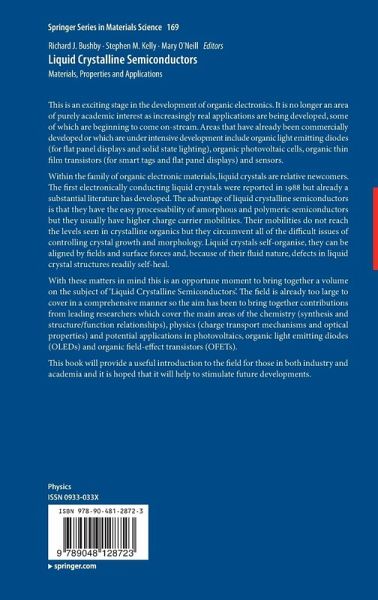 With these matters in mind this is an opportune moment to bring together a volume on the subject of 'Liquid Crystalline Semiconductors'. The field is already too large to cover in a comprehensive manner so the aim has been to bring together contributions from leading researchers which cover the main areas of the chemistry (synthesis and structure/function relationships), physics (charge transport mechanisms and optical properties) and potential applications in photovoltaics, organic light emitting diodes (OLEDs) and organic field-effect transistors (OFETs).