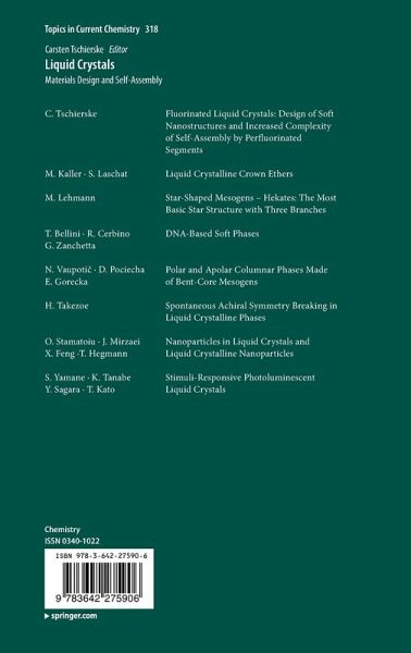 Fluorinated Liquid Crystals: Design of Soft Nanostructures and Increased Complexity of Self-Assembly by Perfluorinated Segments, by Carsten TschierskeLiquid Crystalline Crown Ethers, by Martin Kaller and Sabine LaschatStar-Shaped Mesogens - Hekates: The Most Basic Star Structure with Three Branches, by Matthias LehmannDNA-Based Soft Phases, by Tommaso Bellini, Roberto Cerbino and Giuliano ZanchettaPolar and Apolar Columnar Phases Made of Bent-Core Mesogens, by N. Vaupotic, D. Pociecha and E. GoreckaSpontaneous Achiral Symmetry Breaking in Liquid Crystalline Phases, by H. TakezoeNanoparticles in Liquid Crystals and Liquid Crystalline Nanoparticles, by Oana Stamatoiu, Javad Mirzaei, Xiang Feng and Torsten HegmannStimuli-Responsive Photoluminescent Liquid Crystals, by Shogo Yamane, Kana Tanabe, Yoshimitsu Sagara and Takashi Kato