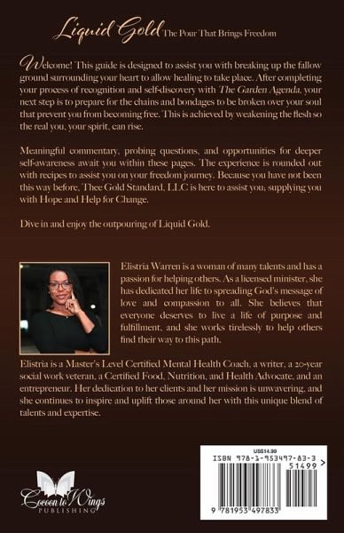 This guide is designed to assist you with breaking up the fallow ground surrounding your heart and allow healing to take place. After completing your process of recognition and self-discovery with The Garden Agenda, your next step is to prepare your soul to break the chains and bondages that prevent you from becoming free. This is achieved by weakening the flesh's nature so that the real you, your spirit, can rise (i.e., fasting). Meaningful commentary, probing questions, and opportunities for deeper self-awareness await you inside this guide. The experience is rounded out with recipes to assist you on your fasting journey. Because you have not been this way before, Thee Gold Standard, LLC is here to assist you, supplying you with Hope and Help for Change. Dive in and enjoy the outpouring of Liquid Gold.