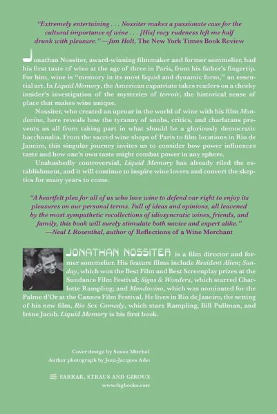 Jonathan Nossiter, award-winning filmmaker and former sommelier, had his first taste of wine at the age of three in Paris, from his father's fingertip. For him, wine is "memory in its most liquid and dynamic form," an essential art. In Liquid Memory, the American expatriate takes readers on a cheeky insider's investigation of the mysteries of terroir, the historical sense of place that makes wine unique. Nossiter, who already created an uproar in the world of wine with his film Mondovino, here reveals how the tyranny of snobs, critics, and charlatans prevents us all from taking part in what should be a gloriously democratic bacchanalia. From the sacred wineshops of Paris to film locations in Rio de Janeiro, this singular journey invites us to consider how power influences taste and how one's own taste might combat power in any sphere. Unabashedly controversial, Liquid Memory has already riled the establishment, and it will continue to stimulate wine lovers and convert the skeptics for many years to come.