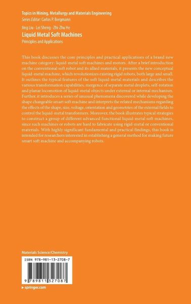 Introduction.- Softness: Another Dimension to Define Nature.- Conventional Soft Machine and Allied Materials.- Basic Properties of Liquid Metal Materials and Soft Matter.- Mechanically Enabled Transformation of Liquid Metal.- Electrically Induced Transformations of Liquid Metal.- SCHEME based Reversible Transformation of Liquid Metal.- Electromagnetic Induced Transformation of Liquid Metal.- Self Fueled Shape Changeable Liquid Metal Machines.- Self Powered Liquid Metal Droplet Motors.- Liquid Metal Based Transient State Machine.- Directional Control of Self Fueled Liquid Metal Machine.- Breathing Enabled Liquid Metal Machine.- Nanoparticles Enabled Liquid Metal Machine.- Substrate Enabled Liquid Metal Machine.- Hybrid Machine Composed of Liquid Metal and Rigid Structure.- Liquid Metal Wheeled 3D Printed Vehicle.