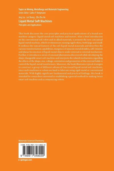 Introduction.- Softness: Another Dimension to Define Nature.- Conventional Soft Machine and Allied Materials.- Basic Properties of Liquid Metal Materials and Soft Matter.- Mechanically Enabled Transformation of Liquid Metal.- Electrically Induced Transformations of Liquid Metal.- SCHEME based Reversible Transformation of Liquid Metal.- Electromagnetic Induced Transformation of Liquid Metal.- Self Fueled Shape Changeable Liquid Metal Machines.- Self Powered Liquid Metal Droplet Motors.- Liquid Metal Based Transient State Machine.- Directional Control of Self Fueled Liquid Metal Machine.- Breathing Enabled Liquid Metal Machine.- Nanoparticles Enabled Liquid Metal Machine.- Substrate Enabled Liquid Metal Machine.- Hybrid Machine Composed of Liquid Metal and Rigid Structure.- Liquid Metal Wheeled 3D Printed Vehicle.