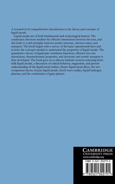 Liquid metals remain of both fundamental and technological interest and the concepts needed to understand their properties are set out in this book, starting from a survey of the basic experimental facts to be explained. The quantitative theory of liquid pair correlation functions, effective ion-ion interactions, thermodynamic properties and electronic and atomic transport is then developed. The book goes on to discuss inelastic neutron scattering, critical behaviour, magnetism, the liquid/metal surface, binary liquid metal alloys, the two component theory of pure liquid metals, shock wave studies, liquid hydrogen plasmas and the constitution of giant planets.