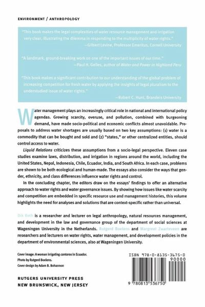 Water management plays an increasingly critical role in national and international policy agendas. Growing scarcity, overuse, and pollution, combined with burgeoning demand, have made socio-political and economic conflicts almost unavoidable. Proposals to address water shortages are usually based on two key assumptions: (1) water is a commodity that can be bought and sold and (2) “states,” or other centralized entities, should control access to water. Liquid Relations criticizes these assumptions from a socio-legal perspective. Eleven case studies examine laws, distribution, and irrigation in regions around the world, including the United States, Nepal, Indonesia, Chile, Ecuador, India, and South Africa. In each case, problems are shown to be both ecological and human-made. The essays also consider the ways that gender, ethnicity, and class differences influence water rights and control. In the concluding chapter, the editors draw on the essays’ findings to offer an alternative approach to water rights and water governance issues. By showing how issues like water scarcity and competition are embedded in specific resource use and management histories, this volume highlights the need for analyses and solutions that are context-specific rather than universal.