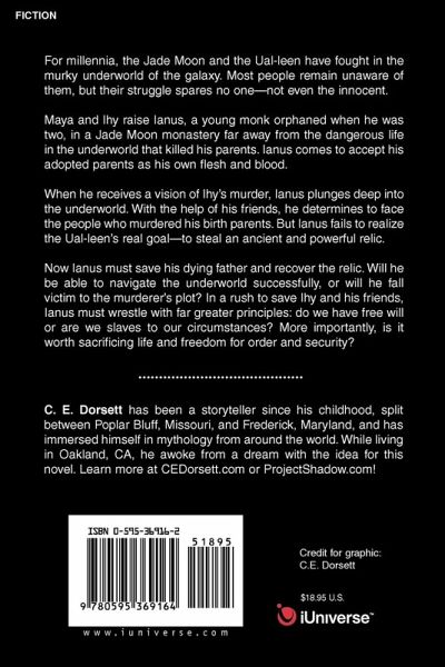 For millennia, the Jade Moon and the Ual-leen have fought in the murky underworld of the galaxy. Most people remain unaware of them, but their struggle spares no one-not even the innocent. Maya and Ihy raise Ianus, a young monk orphaned when he was two, in a Jade Moon monastery far away from the dangerous life in the underworld that killed his parents. Ianus comes to accept his adopted parents as his own flesh and blood. When he receives a vision of Ihy's murder, Ianus plunges deep into the underworld. With the help of his friends, he determines to face the people who murdered his birth parents. But Ianus fails to realize the Ual-leen's real goal-to steal an ancient and powerful relic. Now Ianus must save his dying father and recover the relic. Will he be able to navigate the underworld successfully, or will he fall victim to the murderer's plot? In a rush to save Ihy and his friends, Ianus must wrestle with far greater principles: do we have free will or are we slaves to our circumstances? More importantly, is it worth sacrificing life and freedom for order and security?