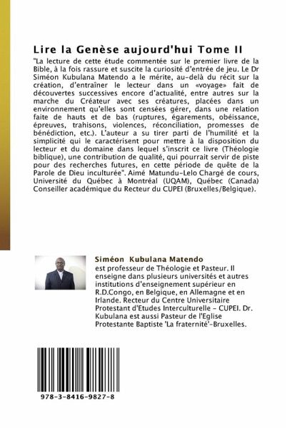"La lecture de cette étude commentée sur le premier livre de la Bible, à la fois rassure et suscite la curiosité d entrée de jeu. Le Dr Siméon Kubulana Matendo a le mérite, au-delà du récit sur la création, d entraîner le lecteur dans un "voyage" fait de découvertes successives encore d actualité, entre autres sur la marche du Créateur avec ses créatures, placées dans un environnement qu elles sont censées gérer, dans une relation faite de hauts et de bas (ruptures, égarements, obéissance, épreuves, trahisons, violences, réconciliation, promesses de bénédiction, etc.). L auteur a su tirer parti de l humilité et la simplicité qui le caractérisent pour mettre à la disposition du lecteur et du domaine dans lequel s inscrit ce livre (Théologie biblique), une contribution de qualité, qui pourrait servir de piste pour des recherches futures, en cette période de quête de la Parole de Dieu inculturée". Aimé Matundu-Lelo Chargé de cours, Université du Québec à Montréal (UQAM), Québec (Canada) Conseiller académique du Recteur du CUPEI (Bruxelles/Belgique).