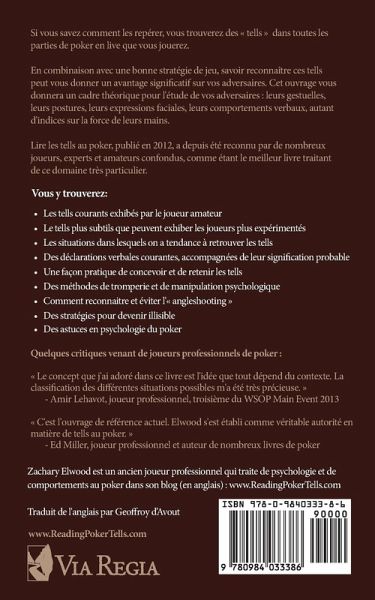 Si vous savez comment les repérer, vous trouverez des tells dans toutes les parties de poker en live que vous jouerez. En combinaison avec une bonne stratégie de jeu, savoir reconnaître ces tells peut vous donner un avantage significatif sur vos adversaires. Cet ouvrage vous donnera un cadre théorique pour l'étude de vos adversaires : leurs gestuelles, leurs postures, leurs expressions faciales, leurs comportements verbaux, autant d'indices sur la force de leurs mains. Lire les tells au poker, publié en 2012, a depuis été reconnu par de nombreux joueurs, experts et amateurs confondus, comme étant le meilleur livre traitant de ce domaine très particulier. Vous y trouverez : .Les tells courants exhibés par le joueur amateur .Le tells plus subtils que peuvent exhiber les joueurs plus expérimentés .Les situations dans lesquels on a tendance à retrouver les tells .Des déclarations verbales courantes, accompagnées de leur signification probable .Une façon pratique de concevoir et de retenir les tells .Des méthodes de tromperie et de manipulation psychologique .Comment reconnaitre et éviter l' angleshooting .Des stratégies pour devenir illisible .Des astuces en psychologie du poker Quelques critiques venant de joueurs professionnels de poker : Un des livres de poker qui m'a le plus aidé. - Andrew Brokos, joueur professionnel et hôte du podcast Thinking Poker Le concept que j'ai adoré dans ce livre est l'idée que tout dépend du contexte. La classification des différentes situations possibles m'a été très précieuse. - Amir Lehavot, joueur professionnel, troisième du WSOP Main Event 2013 C'est l'ouvrage de référence actuel. Elwood s'est établi comme véritable autorité en matière de tells au poker. - Ed Miller, joueur professionnel et auteur de nombreux livres de poker