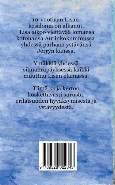 10-vuotiaan Lisan kesäloma on alkanut. Lisa aikoo viettää lomansa kotonansa Aurinkokummussa yhdessä parhaan ystävänsä Jerryn kanssa. Yhtäkkiä yhdessä silmänräpäyksessä kaikki muuttuu Lisan elämässä. Tämä kirja kertoo koskettavasti surusta, erilaisuuden hyväksymisestä, rohkeudesta ja ystävyydestä.