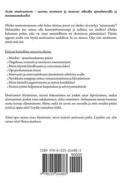 Avain motivaatioon - saavuta tavoitteet ja menesty oikealla ajattelutavalla ja itsetuntemuksella! Oletko motivoitumaton, etkö halua aloittaa jotain vai oletko viivyttelyn "asiantuntija"? Haluaisitko itse asiassa olla kunnianhimoisempi ja todistaa sen itsellesi? Oletko hukannut polun, joka vie sinut ammatilliseen tai yksityiseen päämäärääsi? Tämän oppaan avulla voit löytää motivaatiosi uudelleen. Se on sinussa. Olet vain unohtanut, mistä etsiä sitä. Kirjassa käsitellään seuraavia aiheita:Mindset - ajattelutaulumme päässä Ongelman, resurssin ja tavoitteen tunnistaminen Miten käyttää kiitollisuutta ja vetovoiman lakia? Opi puolustamaan itseäsi Motivaatio ja motivaatiohaaste jännittävien tehtävien avulla Nerokkaita temppuja onnen vastaanottamiseen ja lähettämiseen Miten käsitellä negatiivisuutta ja sisäistä kritiikkiäsi? Sisäistä työtäsi helpottavat harjoitukset ja selviytymistehtävät Motivaation löytäminen, itsensä kokoaminen tai jonkin asian läpivieminen, uuden aloittaminen, jonkin asian uskaltaminen, riskin ottaminen - kohtaamme tämän haasteen useita kertoja elämässämme. Mutta mikä on teoria sen taustalla ja mitä meidän pitäisi tietää ja oppia siitä? Löydät vastaukset täältä. Tämä opas auttaa sinua löytämään, missä etsimäsi motivaatio piilee. Löydätte sen, olen varma siitä! Onnea matkaan.