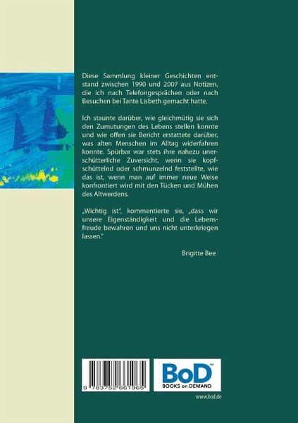Diese Sammlung kleiner Geschichten entstand zwischen 1990 und 2007 aus Notizen, die ich nach Telefongesprächen oder nach Besuchen bei Tante Lisbeth gemacht hatte. Ich staunte darüber, wie gleichmütig sie sich den Zumutungen des Lebens stellen konnte und wie offen sie Bericht erstattete darüber, was alten Menschen im Alltag widerfahren konnte. Spürbar war stets ihre nahezu unerschütterliche Zuversicht, wenn sie kopf-schüttelnd oder schmunzelnd feststellte, wie das ist, wenn man auf immer neue Weise konfrontiert wird mit den Tücken und Mühen des Altwerdens. "Wichtig ist", kommentierte sie, "dass wir unsere Eigenständigkeit und die Lebensfreude bewahren und uns nicht unterkriegen lassen."