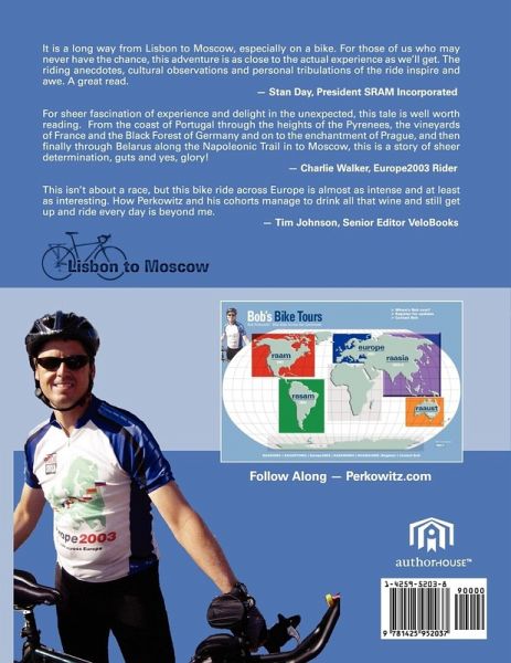 Lisbon to Moscow is a photo journal experience of Bob Perkowitz's bicycle tour across Europe in the Spring of 2003. The journey begins on the shores of Portugal and ends in the heart of the Moscow, offering a glimpse into nine European countries along the way. The book's cast of characters includes various friends and family members that accompanied Bob for parts of his trip, including his wife Lisa Renstrom, colleague Bryan Lawson and his close friend Charlie Walker, the only other person who rode the entire 3,600 mile distance. Their book is filled with the scenery, history and riding anecdotes of a dynamic group. While on the road, team members are faced with demanding conditions, and the difficulties of collective decision-making and managing group logistics. Off the road, however, the major concern was where to best dine and drink wine, while soaking in Europe's rich cultural atmosphere. Perhaps the most interesting characters of the book, however, are the many foreign, yet friendly faces that greeted the riders along their way. These include Polish farmers, French winemakers, and Belarusian prostitutes. In the genre of travel narratives, Lisbon to Moscow appeals both to readers with interest in bike touring as well as those with non-traditional tourist interests through the cities and countryside of Europe. It conveys the sense of adventure and the satisfaction of "seeing the world" through ones own power (bicycle). Actual and wanna-be distance bicycle tourers will also find much useful technical and logistical information. Finally, the book has a certain cultural appeal. What would Europe be without the millions that came before? This is a journey through time - from the Roman and Neapolianic eras through the World Wars to the present day. Europe's collective legacy is an immensely rich cultural heritage. Lisbon to Moscow touches upon these stories, and how they shaped the people met and places Bob Perkowitz and his fellow bike tourists visited that spring.