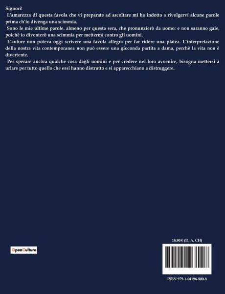 Signori! L¿amarezza di questa favola che vi preparate ad ascoltare mi ha indotto a rivolgervi alcune parole prima ch¿io divenga una scimmia. Sono le mie ultime parole, almeno per questa sera, che pronunzierò da uomo: e non saranno gaie, poichè io diventerò una scimmia per mettermi contro gli uomini. L¿autore non poteva oggi scrivere una favola allegra per far ridere una platea. L¿interpretazione della nostra vita contemporanea non può essere una gioconda partita a dama, perchè la vita non è divertente. Per sperare ancòra qualche cosa dagli uomini e per credere nel loro avvenire, bisogna mettersi a urlare per tutto quello che essi hanno distrutto e si apparecchiano a distruggere.