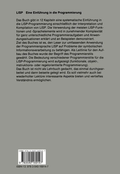 1 Einleitung.- 1.1 Warum LISP?.- 1.2 Zur Entwicklungsgeschichte von LISP.- 1.3 Was sind die Grundbausteine der Programmierung?.- 1.4 Grundbausteine der Programmierung in LISP.- 1.5 Der Inhalt dieses Lehrbuches.- 1.6 Literaturhinweise.- 1.7 Übungen.- 2 Einfache Terme und der Umgang mit Objekten.- 2.1 Einfache Terme.- 2.2 Bezugnahme auf Objekte.- 2.3 Umgang mit Objekten.- 2.4 Die externe Repräsentation von Objekten.- 2.5 Übungen.- 3 Primitive Datenobjekte - zugeordnete Grundfunktionen und externe Repräsentation.- 3.1 Zahlen.- 3.2 Zeichen.- 3.3 Zeichenketten.- 3.4 Symbole (Literal-Atome).- 3.5 Funktionsobjekte.- 3.6 Paare (Cons-Objekte).- 3.7 Weitere Datenstrukturen in verschiedenen LISP-Dialekten.- 3.8 Übungen.- 4 Das LISP-System im einfachen Dialog.- 4.1 Terme sind Listen.- 4.2 Der Dialog mit dem System.- 4.3 Die Umgebung verändert sich.- 4.4 Verschachtelung von Termen.- 4.5 Auswertung von Termen.- 4.6 Quotierung - Beabsichtigte Suspendierung der Auswertung.- 4.7 Die Wahrheitswerte T und NIL.- 4.8 Übungen.- 5 Funktionsdefinition als Abstraktion über Termen.- 5.1 Was ist Abstraktion.- 5.2 Funktionale Abstraktion in LISP.- 5.3 Auswertung von Termen mit LAMBDA-Ausdrücken als Funktion.- 5.4 Beziehungen zwischen Umgebungen - globale und lokale Effekte.- 5.5 Bedingte Ausdrücke - Verwendung und Verknüpfung von Prädikaten.- 5.6 Ein größeres Beispiel: Die Baukastenwelt ("Blocks World").- 5.7 Literaturhinweise.- 5.8 Übungen.- 6 Komplexe Datenstrukturen und ihre Verarbeitung - Rekursion und Iteration.- 6.1 Zusammensetzen (Kombinieren) von Daten zu komplexeren Strukturen.- 6.2 Datenabstraktion.- 6.3 Lineare Datenstrukturen und lineare Rekursion.- 6.4 Hierarchische Datenstrukturen und Baum-Rekursion.- 6.5 Arithmetische Ausdrücke als hierarchischeStrukturen - Anwendungsbeispiel: Vereinfachung.- 6.6 Rekursive Funktionen zur Manipulation von S-Ausdrücken.- 6.7 Literaturhinweise.- 6.8 Übungen.- 7 Kontrollstrukturen, Spezialformen und Macros.- 7.1 Was sind Kontrollstrukturen?.- 7.2 Wozu werden Spezialformen benötigt?.- 7.3 Die verallgemeinerte Variablenliste.- 7.4 Definition von Spezialformen: FEXPRs, FLAMBDAs und NLAMBDAs.- 7.5 Definition von Spezialformen: Macros und MLAMBDAs.- 7.6 Memo-Funktionen: Ein Beispiel für Macros.- 7.7 Sind FEXPRs wirklich erforderlich?.- 7.8 Literaturhinweise.- 7.9 Übungen.- 8 Ein- und Ausgabe.- 8.1 Dateien als Objekte.- 8.2 Spezifikation von Dateien.- 8.3 Allgemeines über die Ein-/Ausgabe.- 8.4 Eingabe.- 8.5 Lexikalische Verarbeitung und syntaktische Klassifikation von Zeichen.- 8.6 Read-Macros.- 8.7 Ausgabe.- 8.8 Ströme und die Simulation von Ein-/Ausgabe-Vorgängen durch Pseudo-Dateien.- 8.9 Direktzugriff auf Dateien.- 8.10 Literaturhinweise.- 8.11 Übungen.- 9 Funktionsobjekte.- 9.1 Funktionale. Funktionen, die Funktionen als Argumente haben.- 9.2 Probleme mit Funktionsobjekten.- 9.3 Generatoren und Ströme.- 9.4 Objekt-orientierte Programmierung und Prozeßsimulation.- 9.5 Simulation durch Funktionsobjekte mit zugeordneter Umgebung.- 9.6 Das Hafenmodell: Ein konkretes Simulationsbeispiel.- 9.7 Literaturhinweise.- 9.8 Übungen.- 10 Generische Funktionen und datengesteuerte Programmierung.- 10.1 Gründe für eine weitere Abstraktionsstufe.- 10.2 Generische Funktionen.- 10.3 Realisierung generischer Funktionen.- 10.4 Flavors: Ein neues Konzept für generische Funktionen und Nachrichtenaustausch.- 10.5 Grundstrukturen und generische Operationen in LISP-Systemen.- 10.6 Aspekte der datengesteuerten Programmierung.- 10.7 Literaturhinweise.- 10.8 Übungen.- 11 Regel-orientierteProgrammierung.- 11.1 Programmierstile und Informationsverarbeitungsmodelle.- 11.2 Grundbegriffe des Mustervergleichs.- 11.3 Mustervergleich mit strukturierten Daten.- 11.4 Unifikation.- 11.5 Einfache Produktionensysteme.- 11.6 Verallgemeinerte Produktionensysteme.- 11.7 Literaturhinweise.- 11.8 Übungen.- 12 Verarbeitung von LISP in LISP.- 12.1 Interpretation von LISP.- 12.2 Realisierung von Umgebungen - Bindungsstrategien.- 12.3 LISP-Interpreter für verschiedene Bindungsstrategien.- 12.4 Prinzipien der Compilation von LISP.- 12.5 Elemente der Assemblersprache in LISP und ihre Verwendung bei der Compilation.- 12.6 Literaturhinweise.- 12.7 Übungen.- Anhänge.- 13 Einige Bemerkungen über Programmiersysteme für LISP.- 14 Funktionenverzeichnis.- 15 Übersicht über die Abweichung der Funktionsdefinition in anderen LISP-Dialekten.- 16 Literaturverzeichnis.- 17 Namen- und Sachverzeichnis.